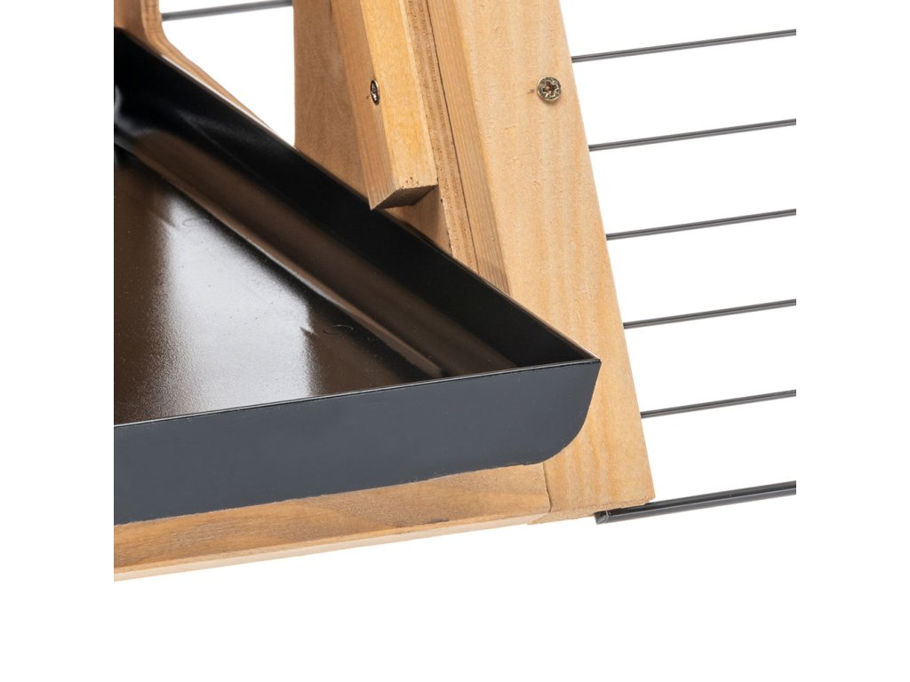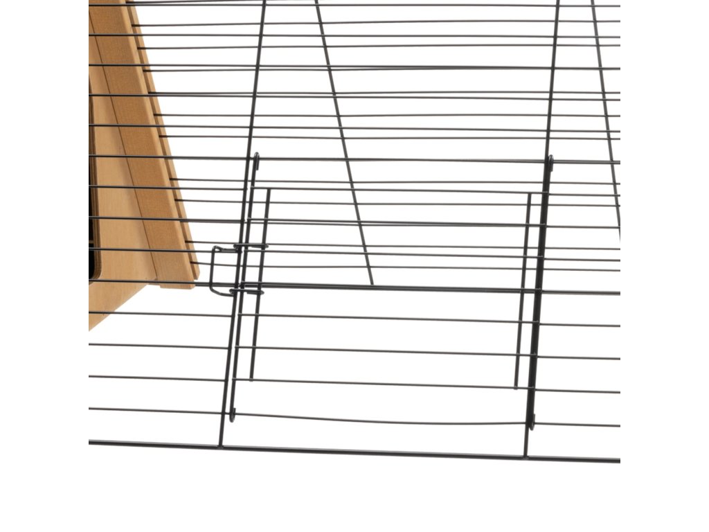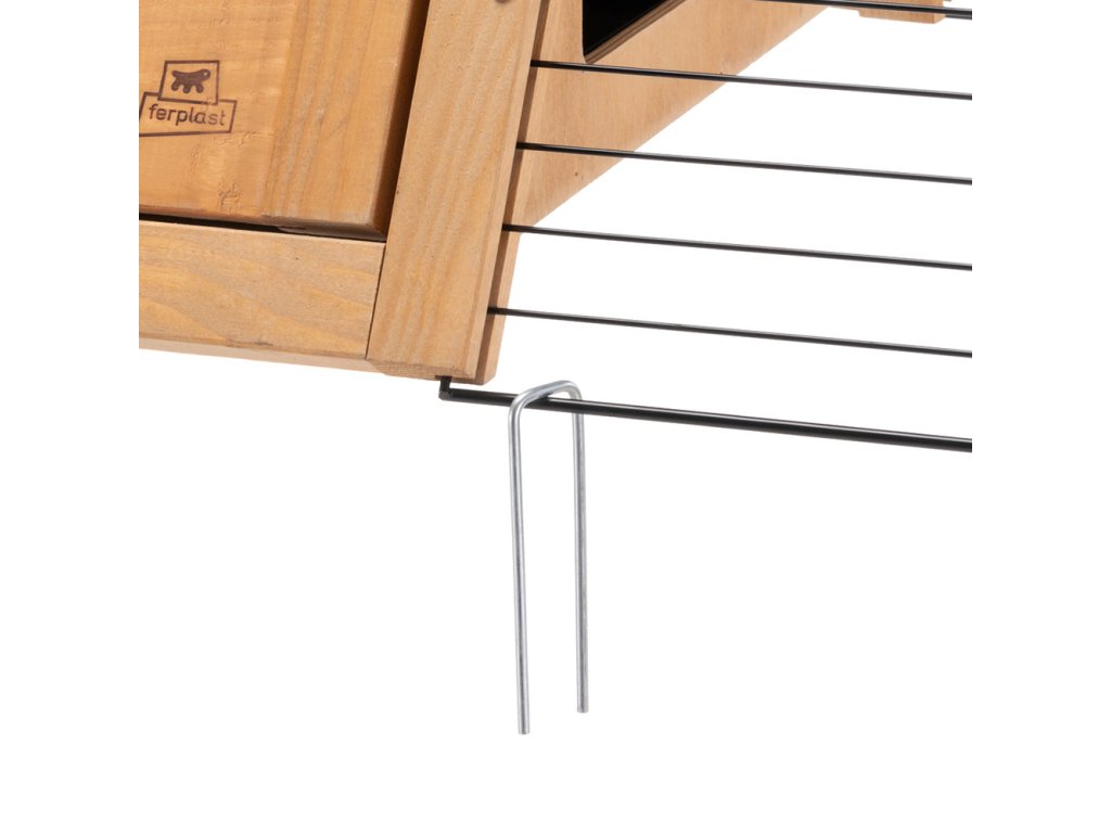 Mřížka klece je vyrobena z recyklovaného železa a je robustní a odolná. Boční dvířka klece umožňují králíkům nebo morčatům širší přístup a větší volnost pohybu. Klec lze bezpečně připevnit k zemi pomocí šesti sloupků, takže zůstane stabilní i za větru a počasí.